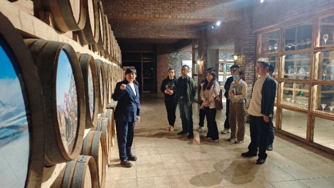 随后,党员们走进志辉源石酒庄。在占地2000亩的生态园区内,酒庄讲解员详细介绍了“戈壁荒滩变绿洲”的蜕变历程。党员们深入葡萄种植园和地下酒窖,了解葡萄酒全生命期酿造过程,实地见证了“绿水青山就是金山银山”理念的生动实践,对生态产业融合发展的创新路径有了具象认知。