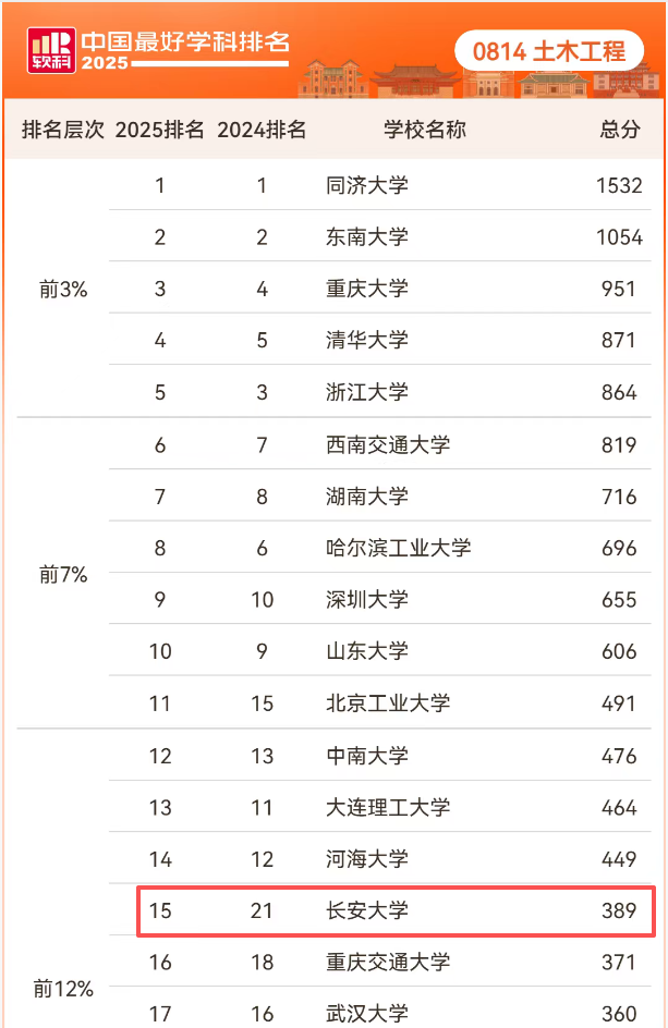 10月15日,著名高等教育评价机构——上海软科正式发布“2025软科中国最好学科排名”,全国共有167所设点高校参与土木工程学科排名,本次公布排名前50%高校(共计83所)。2025年,由无码av 牵头建设的土木工程学科位列第15位,由2024年的第21位上升至第15位,稳居全国前12%。